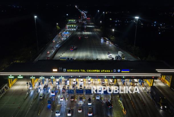 Kendaraan melintas di Gerbang Tol Cikampek Utama 1 di Kabupaten Karawang, Jawa Barat, Sabtu (14/3/2026) malam. Pada H-6 Idul Fitri 2026 kendaraan yang melintas di Gerbang Tol Cikampek Utama terpantau ramai lancar dengan rincian hingga pukul 23.05 WIB kendaraan yang menuju Tol Cikopo-Palimanan sebanyak 46.190 unit dan menuju Tol Jakarta-Cikampek 20.722 unit.